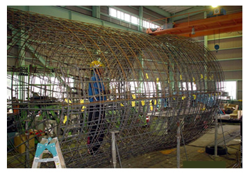 構造解析結果を基に躯体厚、配筋を決定し加工図を作図します。その後、原寸の型紙を出力し、成型鉄筋トラスを製作します。