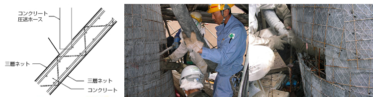 コンクリートの仕様については、特記仕様書によります。コンクリートの打設口は、高さ1,800mm(型枠用ネット2枚分)の位置でネット上端を水平に連続して開けておき、打設後に結束で塞いでいきます。