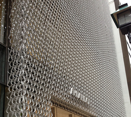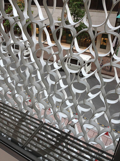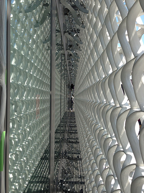 ポイント | 約7,500m2の外壁を植物をモチーフにした3次元のアルミキャストスクリーンで覆っている。 キャストスクリーンは、巾1.5m×高さ4.2mのパネルとなっており、同じく有機的な形状をもつ。 ステンレススチール製のファスナーで支持されている。 耐震・耐風圧性能はもちろん、光触媒コーティングにより、耐汚染性能考慮した。 パネルとなったアルミキャストの目地が目立たないように、そのジョイントは直線ではない工夫がされている。 このアルミキャストの製造には、特殊な砂型製法を開発することで成功した。 |