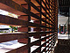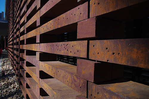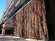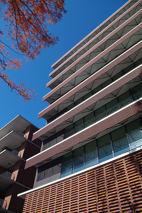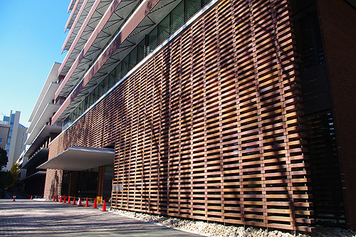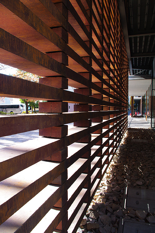 遮光を目的とした高層部の楕円形テラコッタルーバー、片持ちのスクリーンを支持するパイプジョイントを極力シンプルにした納まりとしている。 低層部の煉瓦積層スクリーンはレンガの色、質感に特色があり乾式工法による納まりとしている。