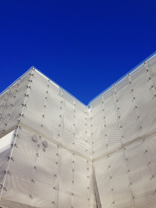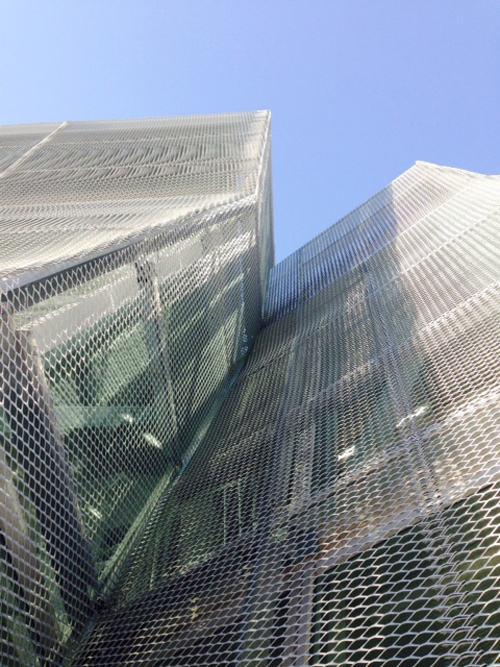 のアルミエキスパンドメタルで覆っている。t2.0mmの軽やかなエキスパンドメタルをラップジョイントさせることで目地を目立たなくさせ、建築のボリューム感が引き立つように工夫した。