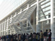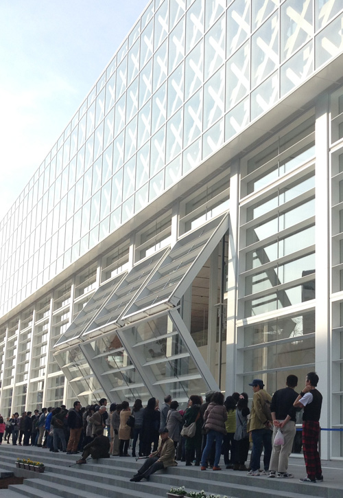 美術館のメインファサード部分に、W5700mm×H10,000mmの開口サイズで、大型水平折戸が14スパン分並んでいる。この水平折戸を開放することで、美術館のアトリウム空間と屋外空間が一体となる仕掛けである。水密・気密性能を確保した稼働扉としては、国内最大である。折戸1機の重量は、約5tである。庇としての跳ね出し距離は、約4mとなる。