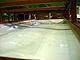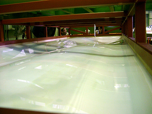ガラス内側のスクリーンにドットパターンをシルク印刷したアクリル板を真空成形で3次曲面に加工することで、霧の様なイメージを実現させた。