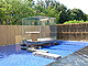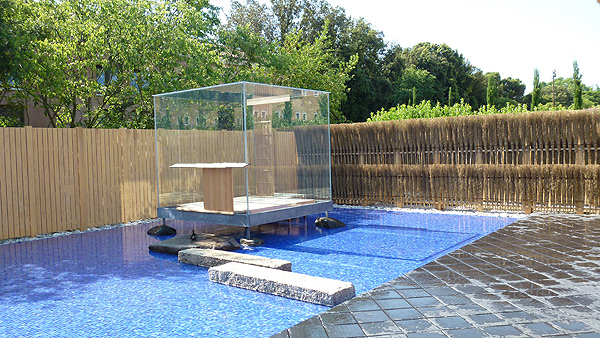 2014年ヴェネチアビエンナーレで発表された杉本博司氏の作品。テーマは「水」と「ガラス」。最大のこだわりは、品質の高い日本製を現地に設置すること。 約2.4m×2.4m×2.4mのガラス茶室は、4本の細い脚に支えられたスチール土台と5面のガラスで構成されている。 自立手摺構法を応用し、上部に支持金物の無いより透明度の高いガラスキューブを実現している。