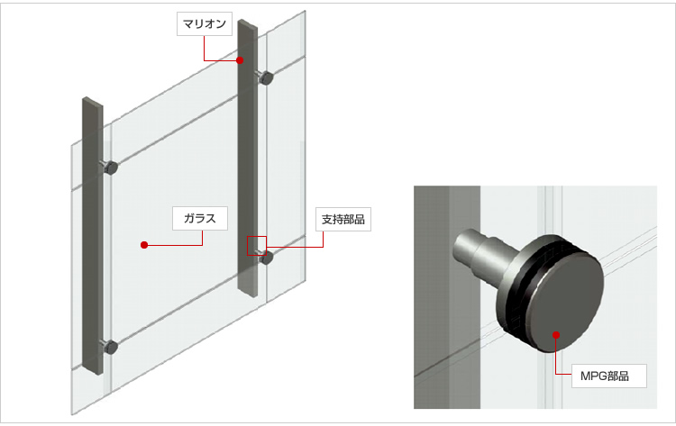 ガラスのエッジ部分を内外からMPG部品で挟みこんで固定する工法です。ガラスの周囲にサッシ枠がないため、フラットで透明なガラスファサードを構成できます。