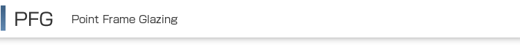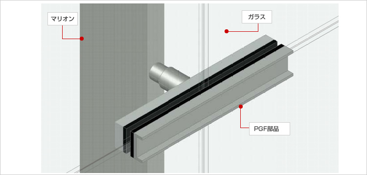 ガラスのエッジ部分を内外からPFG部品で挟みこんで固定する工法です。