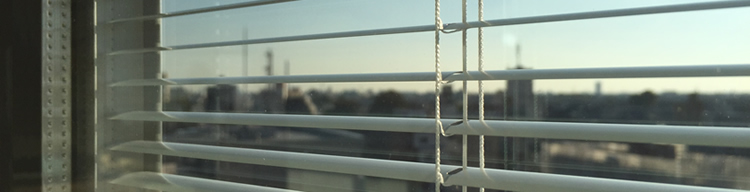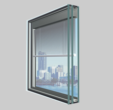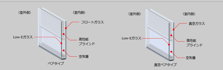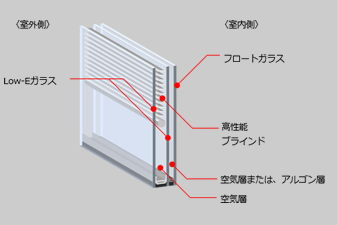 内蔵されたブラインドは上げ下げ自由で、角度調節も自在です。時間毎、日毎、季節毎の環境の変化に対し、自由に調整が可能です。また、ブラインドには、赤外線を反射する特殊なコーティングが施されており、これによって、日射を室外側に反射し、室内の温度上昇を抑制します。このブラインドを調節することで、熱的性能だけでなく、眩しさや視界の制限といった調整が可能です。 |