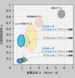 スラティアの構成例と性能値 ![]() 各値はJISに基いて算出したものです。 U値:熱貫流率(W/m2k)、η値:日射熱取得率 |