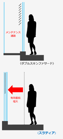 ダブルスキンファサードに対し、スラティアは以下の長所があります。 (1)シングルスキンのため室内空間が広くなり、レンタブル比が高まります。 (2)ダブルスキンファサードは外気導入により、ブラインド、ガラスに汚れが (3)サッシがひとつで済むため、施工がより簡易でコストが削減できます。 (4)ブラインドに触れることがないため、折れたりよれることがありません。 |