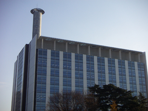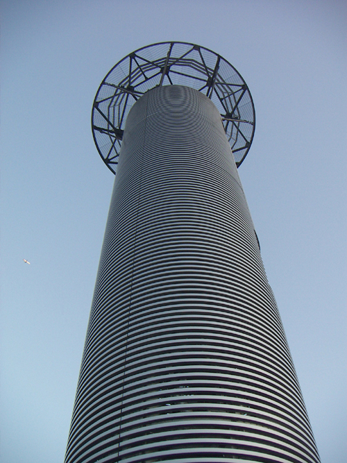 環境配慮型建物というコンセプトのもと、「風」をキーワードにエアロルーバー採用。鉄塔ルーバーはR2400の円筒型で、意匠的にも目を惹くものとなっている。