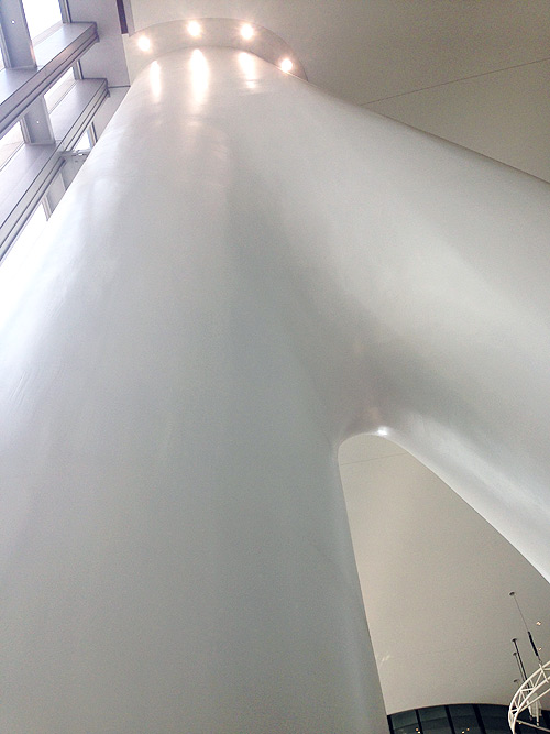 ニュートラスウォールの特徴である曲面成形性を生かし、建物全体の不定形曲面を実現。