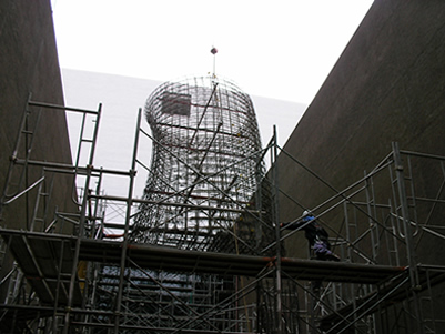 鉄筋の組立完了後、型枠用ネットを内外面の未設置部分に結束線を用いて取付けます。