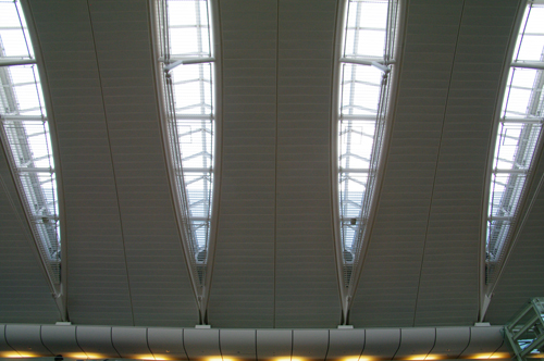 吸音パネルを専用金具とワイヤーにより二重の落下防止対策を行っている。