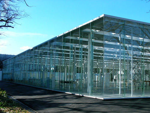 林の木々のように立つ柱を透明なガラスの箱で覆い、空間の曖昧さを極限まで追求するため、リブガラス工法を採用している。