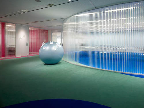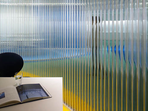海外製特注管ガラス(φ60、t5、L2600)を約1000本使用して、水のゆらぎを表現。間仕切り壁としての機能を持ちながらも、人の気配が感じられるものとなっている。