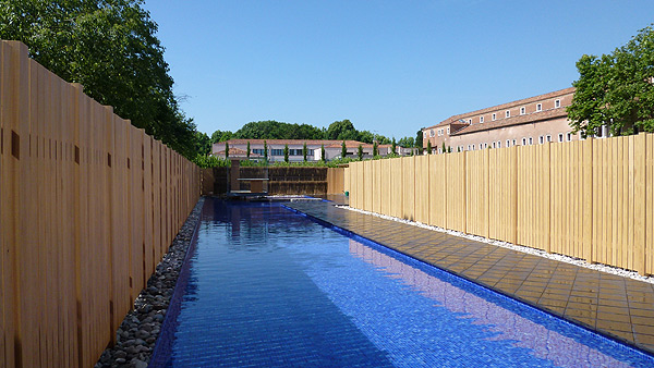 2014年ヴェネチアビエンナーレで発表された杉本博司氏の作品。テーマは「水」と「ガラス」。最大のこだわりは、品質の高い日本製を現地に設置すること。 約2.4m×2.4m×2.4mのガラス茶室は、4本の細い脚に支えられたスチール土台と5面のガラスで構成されている。 自立手摺構法を応用し、上部に支持金物の無いより透明度の高いガラスキューブを実現している。