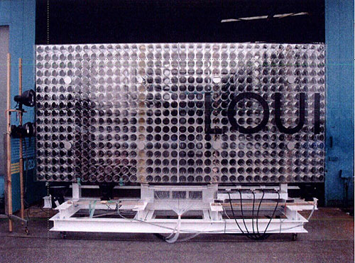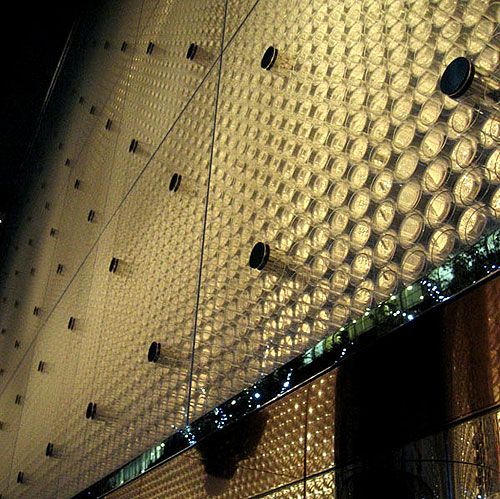直径100mm、長さ300mmの高透過ガラスチューブを約28,000本を俵積みしたイメージデザイン。鏡面ステンレスパネルで固定されたガラスチューブは六本木の光・風景を乱反射させる。 昼間は外光を、夜間は店内光を透過させるため、ガラス管の固定支持方法の選定と、精密な精度を要求されるディテールとなるため、工場でのユニット化が重要なポイントとなった。