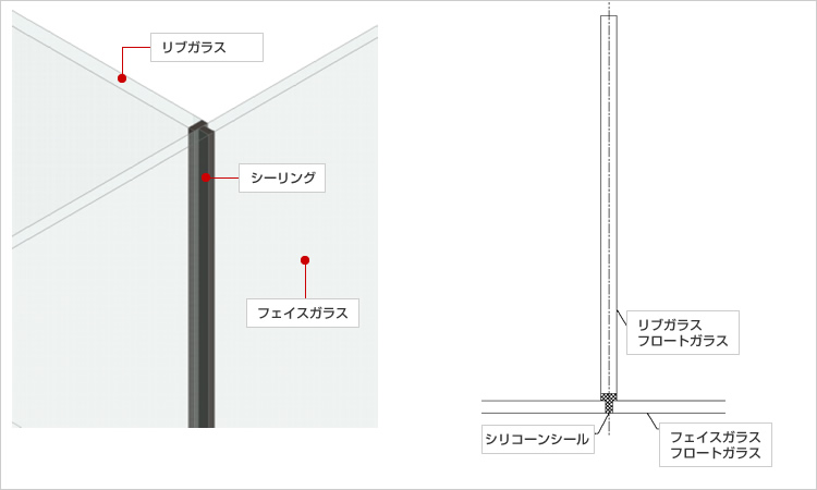 フェイスガラスとリブガラスをシリコーン接着して固定する工法です。