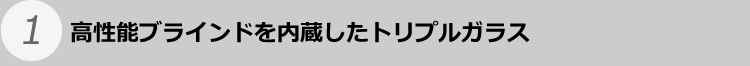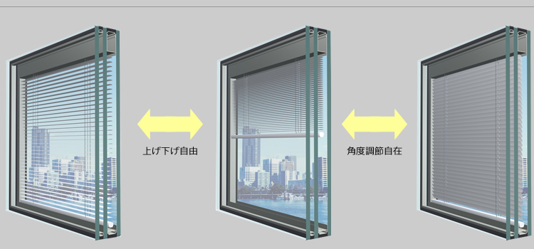 内蔵されたブラインドは上げ下げ自由で、角度調節も自在です。時間毎、日毎、季節毎の環境の変化に対し、自由に調整が可能です。また、ブラインドには、赤外線を反射する特殊なコーティングが施されており、これによって、日射を室外側に反射し、室内の温度上昇を抑制します。このブラインドを調節することで、熱的性能だけでなく、眩しさや視界の制限といった調整が可能です。 |