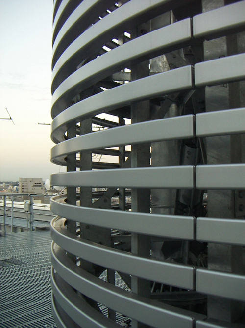 環境配慮型建物というコンセプトのもと、「風」をキーワードにエアロルーバー採用。鉄塔ルーバーはR2400の円筒型で、意匠的にも目を惹くものとなっている。