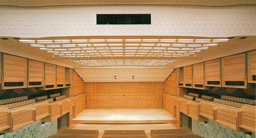 不燃・軽量・高意匠・安全性から、音響用可動式垂壁が採用された。