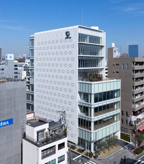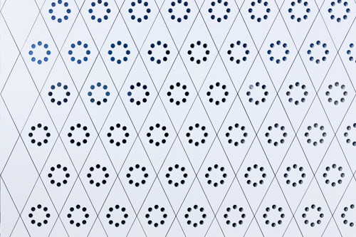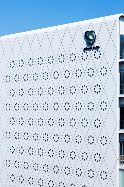 繊維製品のイメージをコンセプトにし、編まれた繊維の模様が強調できるよう、ガラス象嵌GRCで菱形のパネルを提案した。ガラス廻りの止水等も含め満足いただけるものとなった。