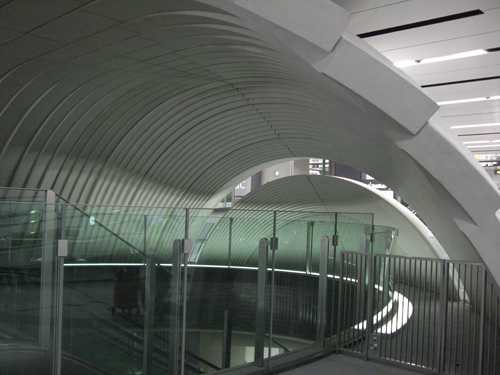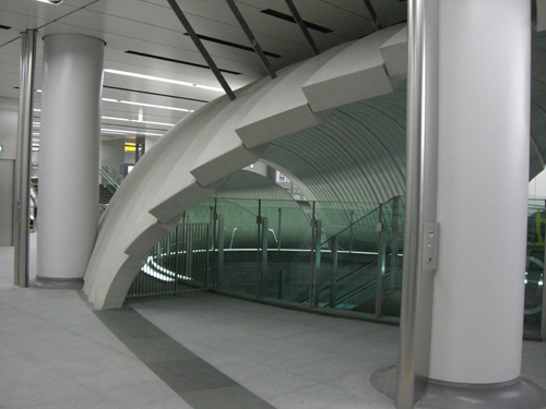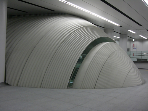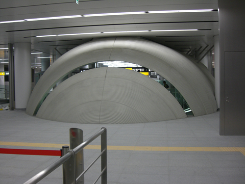 地下鉄工事の特殊性(重量・振動)をクリアしデザインイメージである"地宙船"を実現するため、軽量で高意匠のGRCが採用をされた。