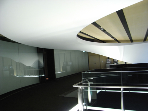 プロジェクターのスクリーンとしての機能と、デザイナーのイメージした輪転機から出てくる新聞を表現するため、GRGの平滑な仕上げ、軽さ、自由な造形性、耐火性が採用のポイントとなった。
