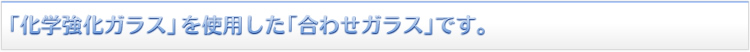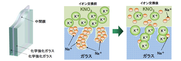 ・化学強化ガラスとは、フロート板ガラスを溶融した硝酸カリウムKNO3に浸漬して、ガラス表面のイオン半径の 小さなNa+を、より半径の大きいK+に置換して、ガラス表面に圧縮応力層を形成させた強化ガラスです。 ・合わせガラスとは、2枚のガラスの間に強靭な中間膜を挟みこんだサンドイッチ構造のガラスです。